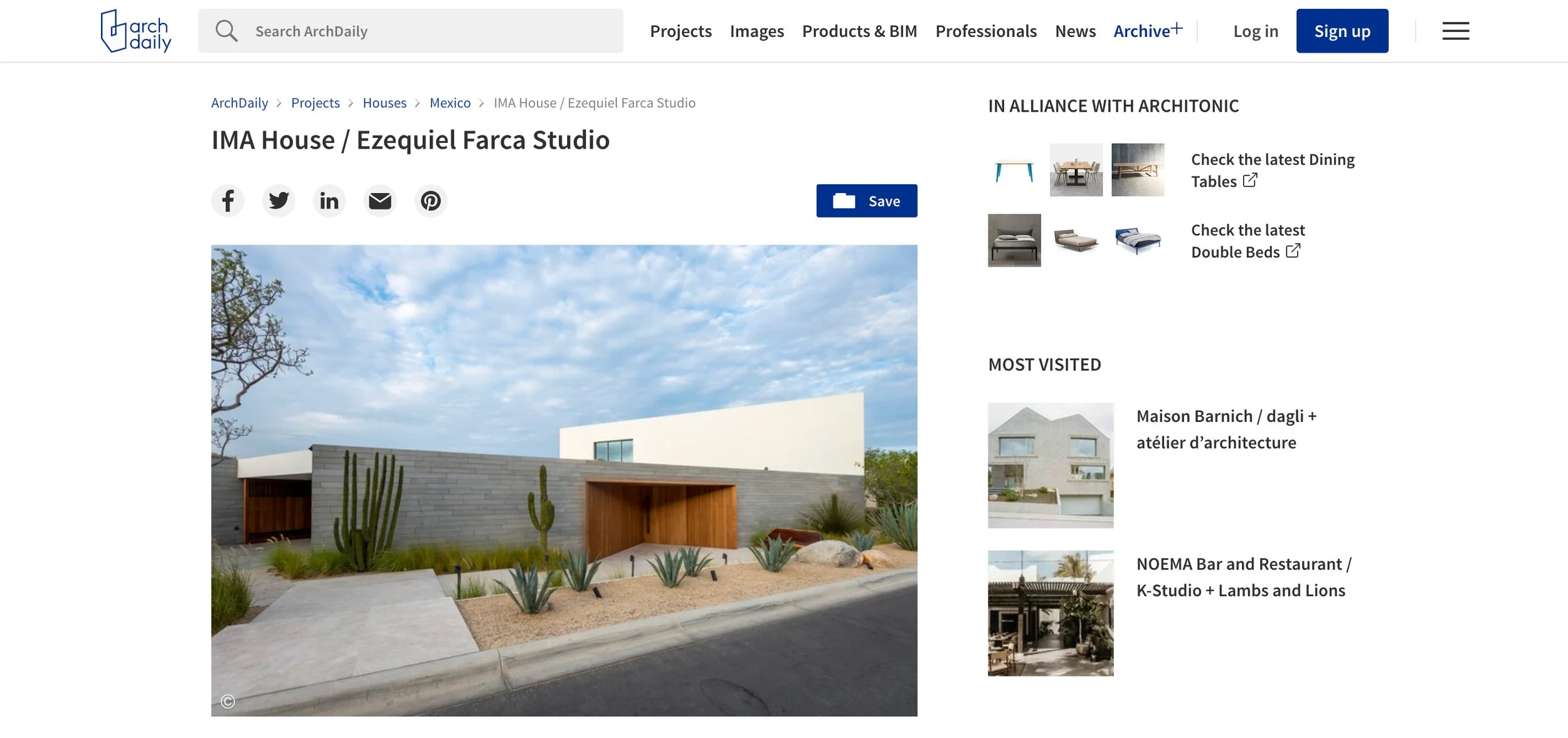 This residential project is located on an elongated site overlooking the sea of Cabo San Lucas, Mexico. A formal language was established through a series of large, rammed earth walls, patios that configure the different spaces within the house, and several water mirrors complete with small waterfalls that function as elements of serenity.