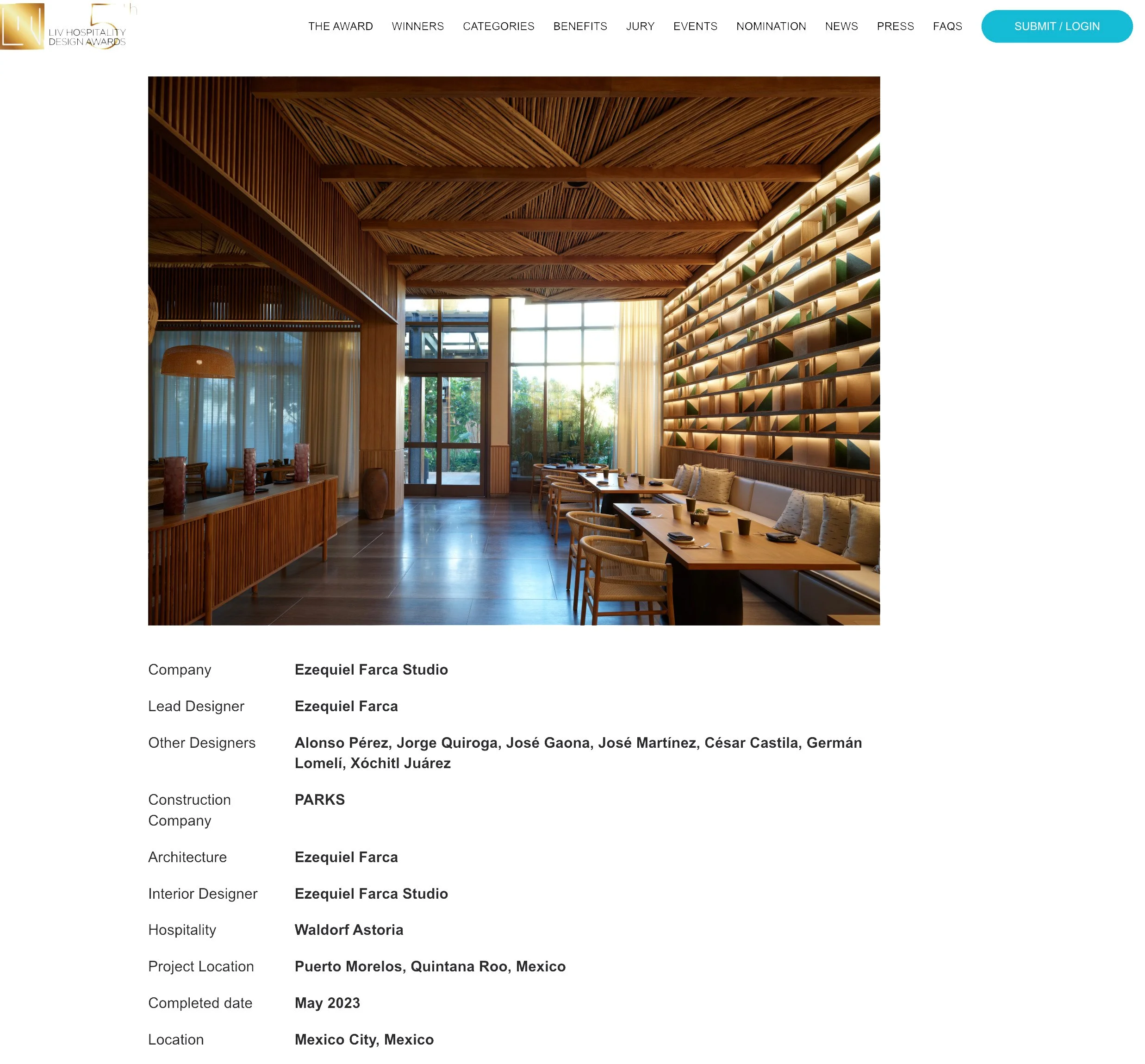 Jao is a winner of LIV 2024 Feb 5 Written By Guillermo Ortiz Our project Jao Waldorf Astoria win the LIV Hospitality Design Award 2024 Guillermo Ortiz