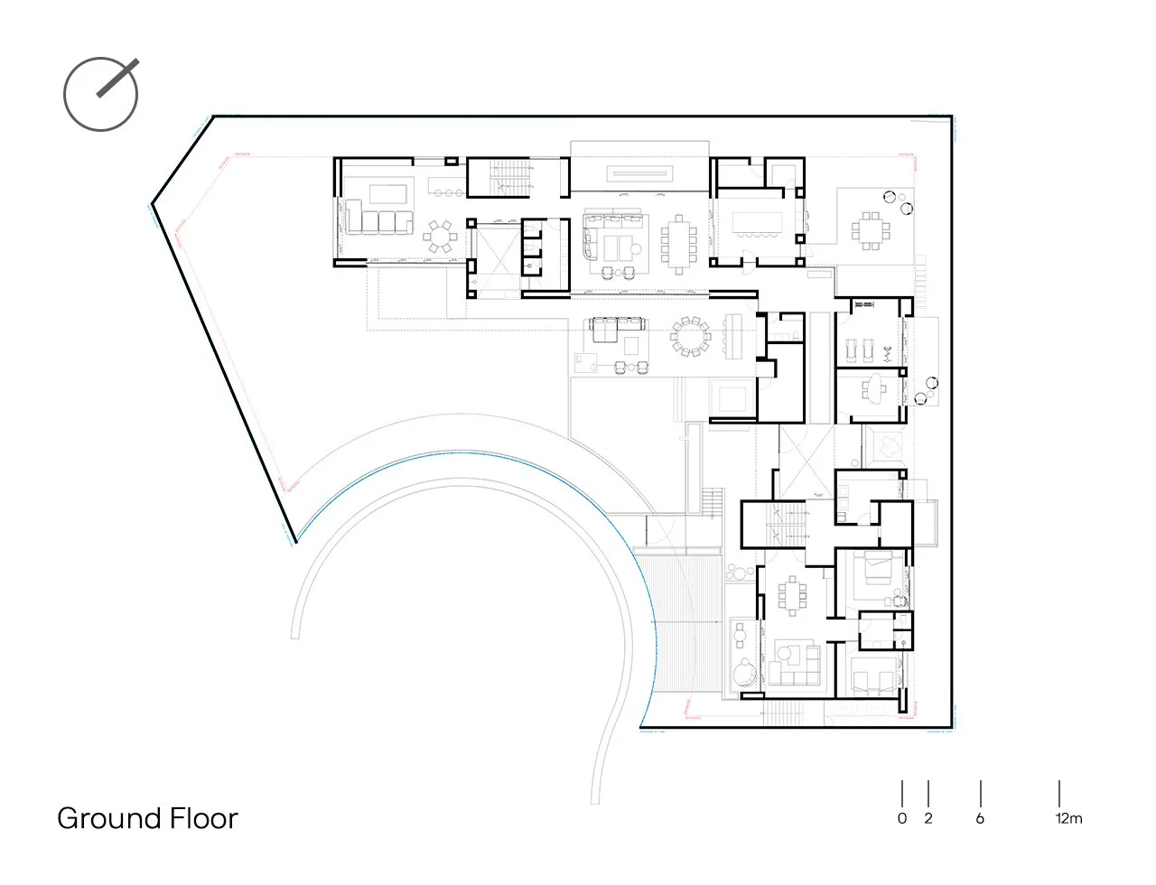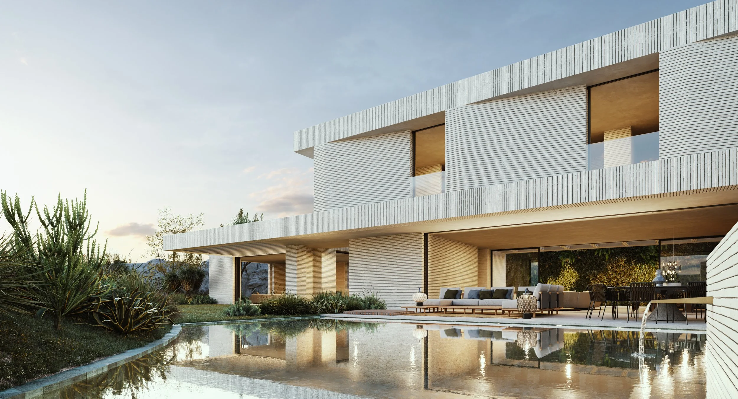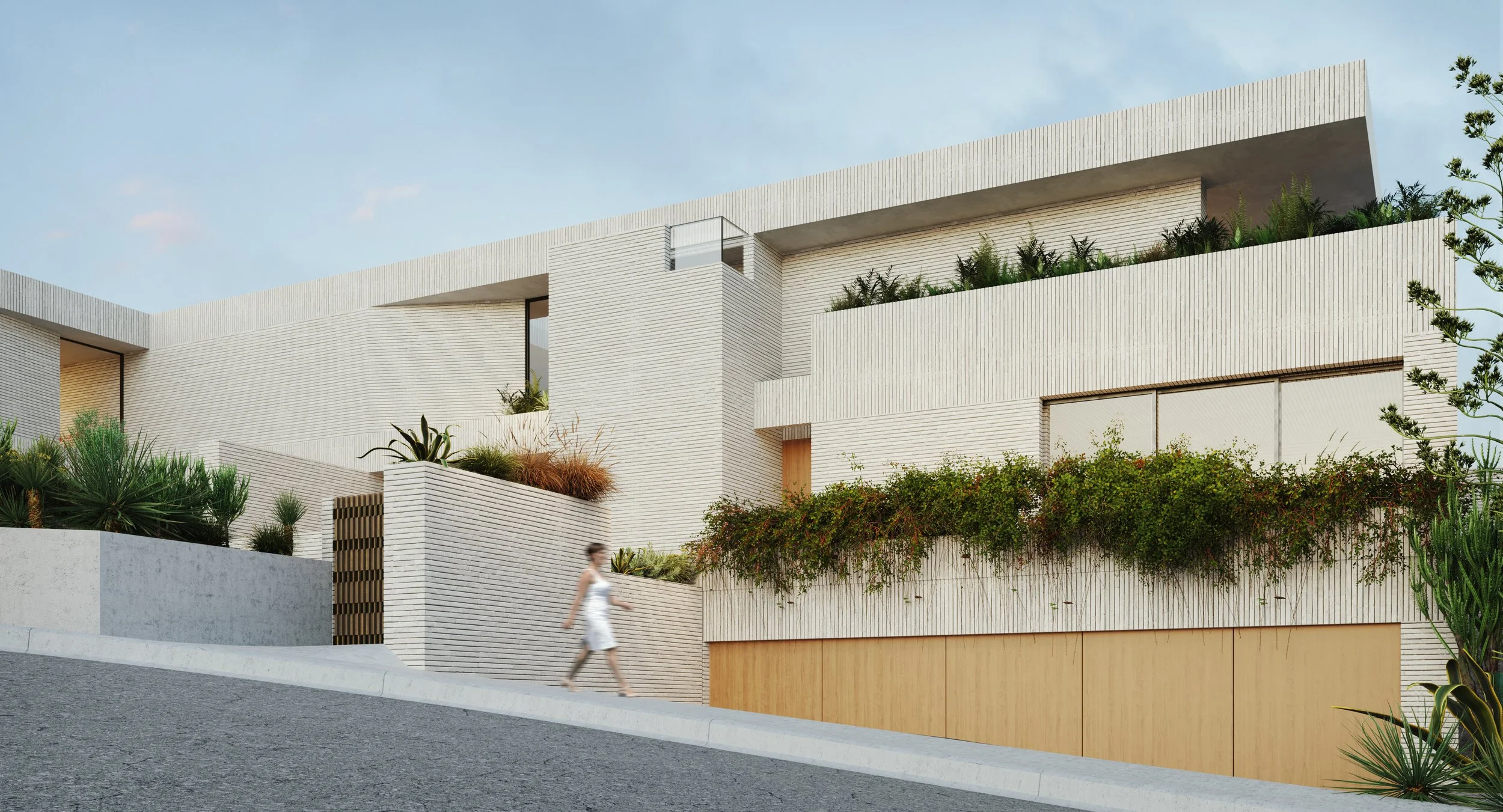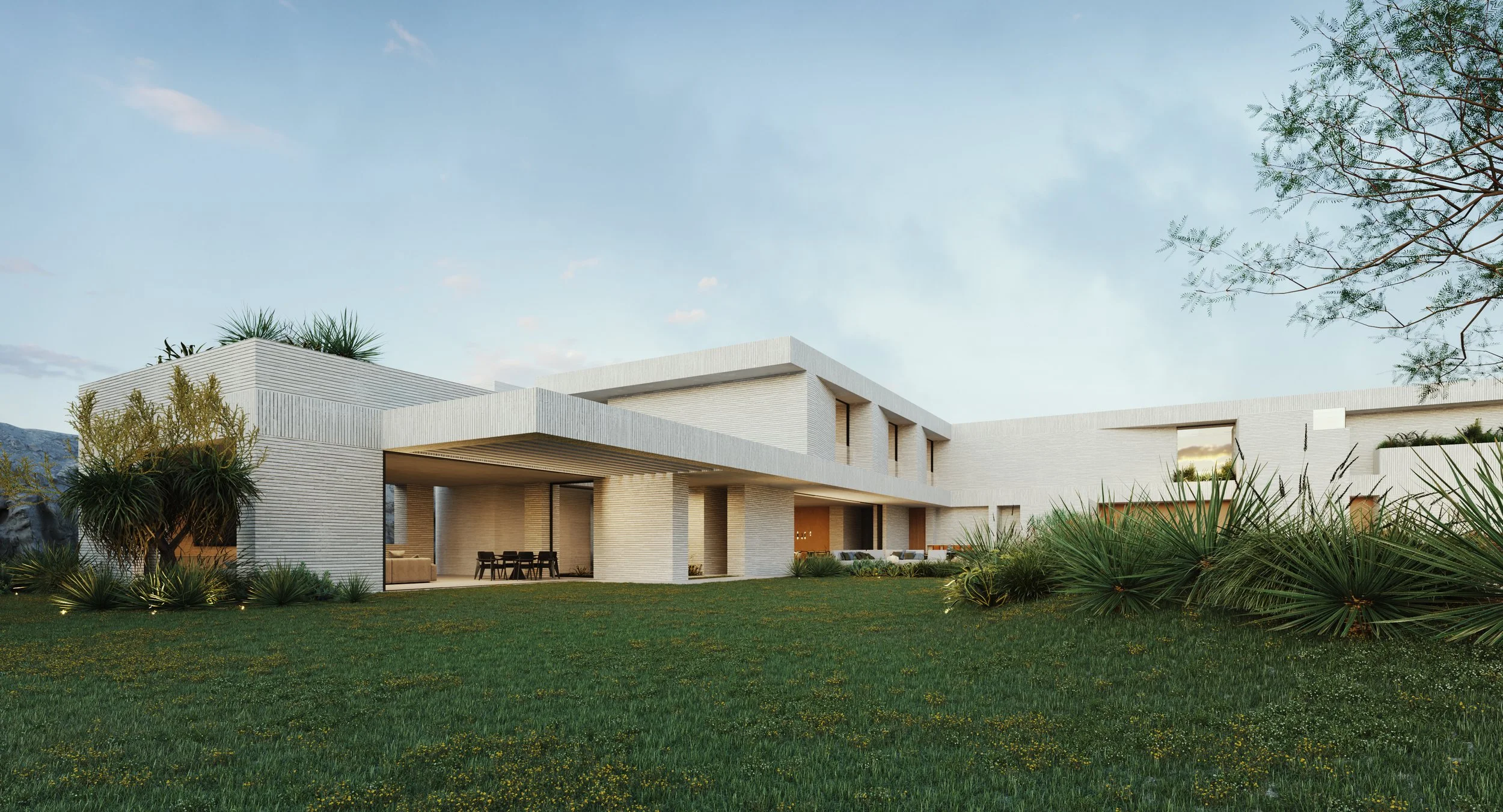 The project seeks climatic comfort by integrating patios and openings that optimize natural light and ventilation, reducing energy use throughout the year. Private areas are positioned along the site’s straight edges, while public and social spaces open toward the street, allowing views from the bedrooms toward both the social core and the city. The façades are clad in ochre stone slabs, providing durability against desert winds while reflecting sunlight to minimize heat gain.