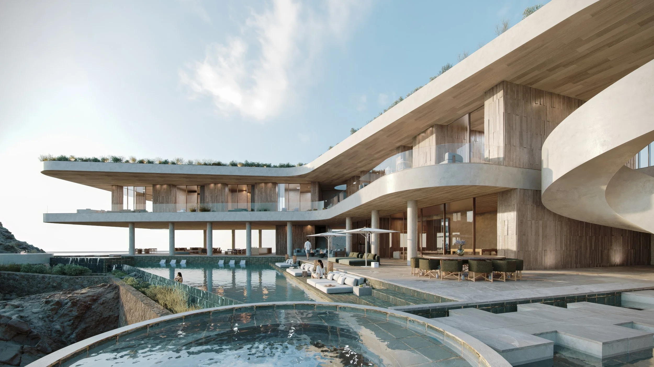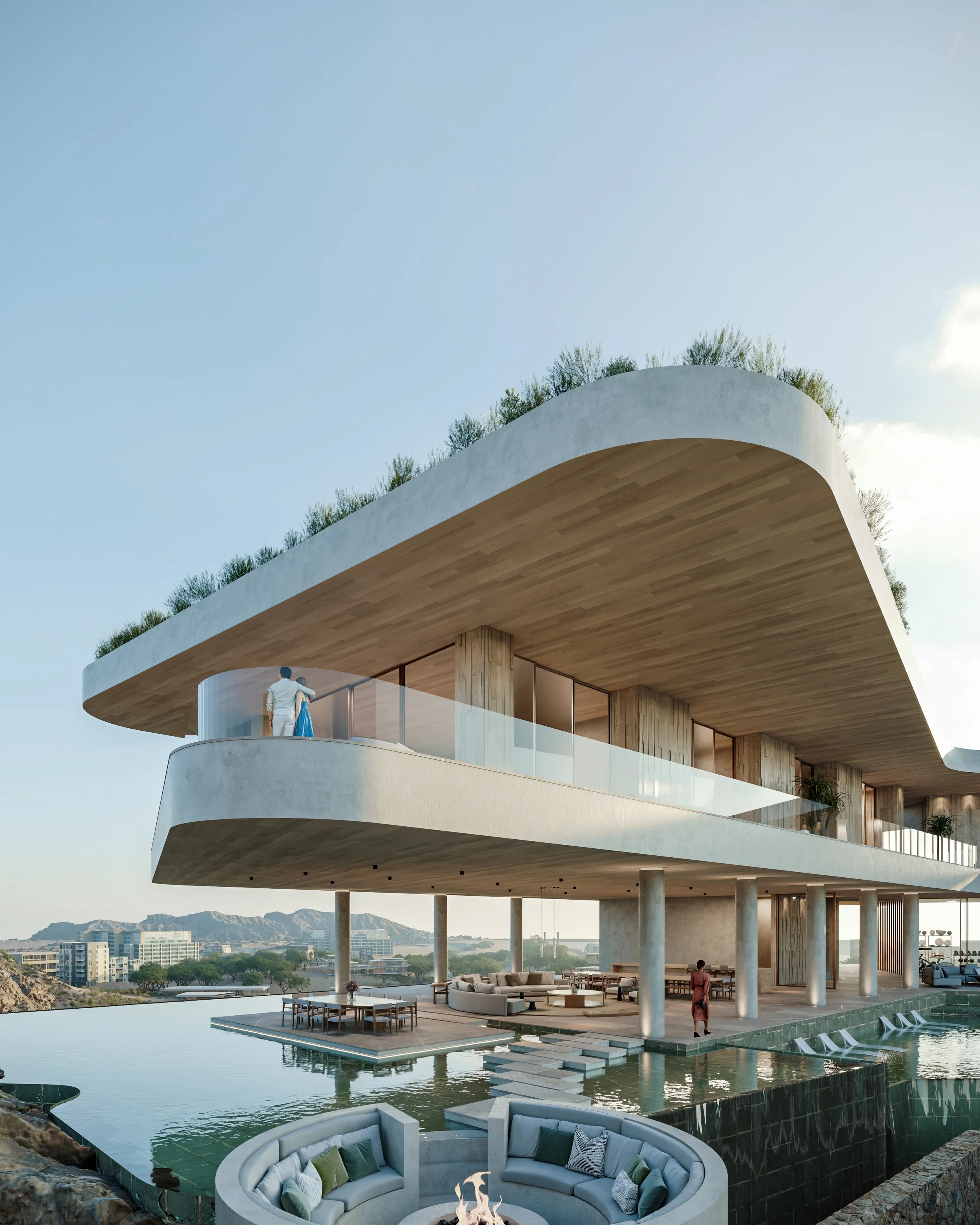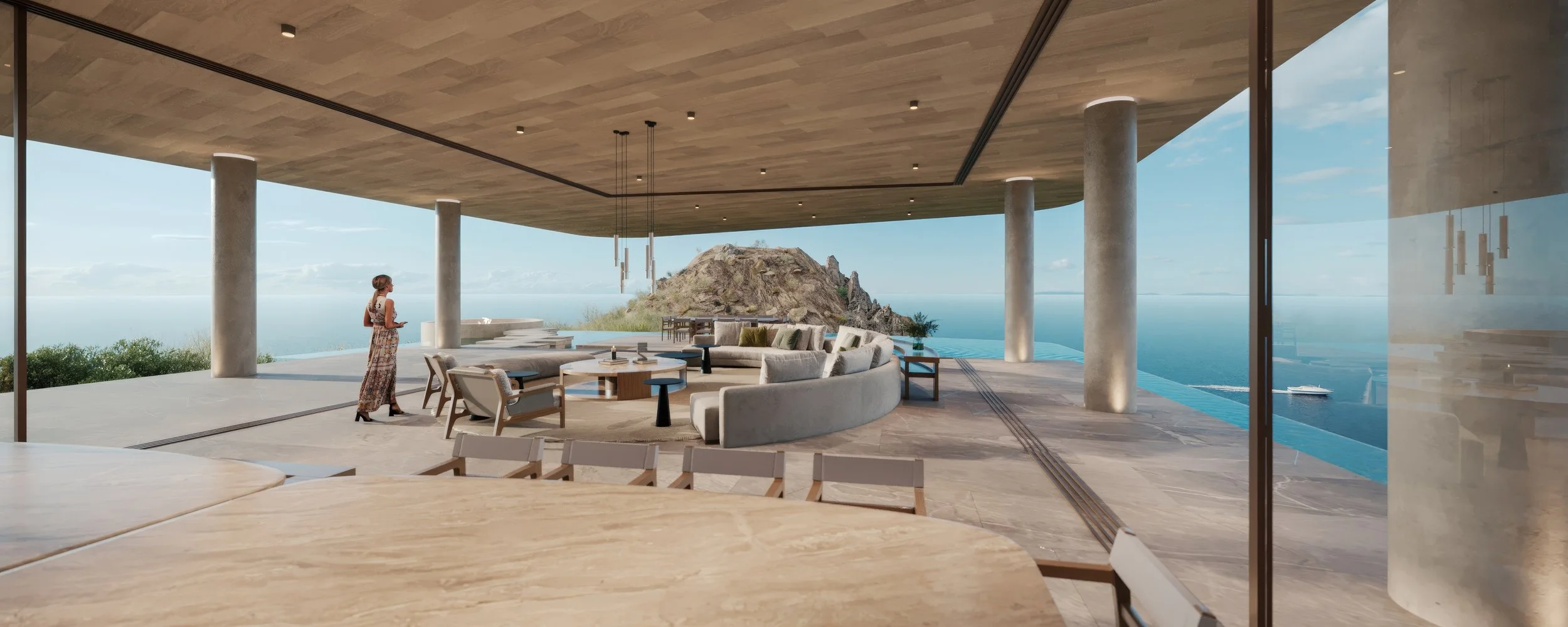 Built with natural stone, wood, and glass, Cielo 17 embraces organic materials that reflect the raw beauty of Baja California. Its tiered structure follows the mountain’s natural contours, creating a home that feels both protected and limitless. Expansive floor-to-ceiling glass walls flood the interiors with natural light and frame the ever-changing sky, while open-air terraces blur the line between indoor and outdoor living.