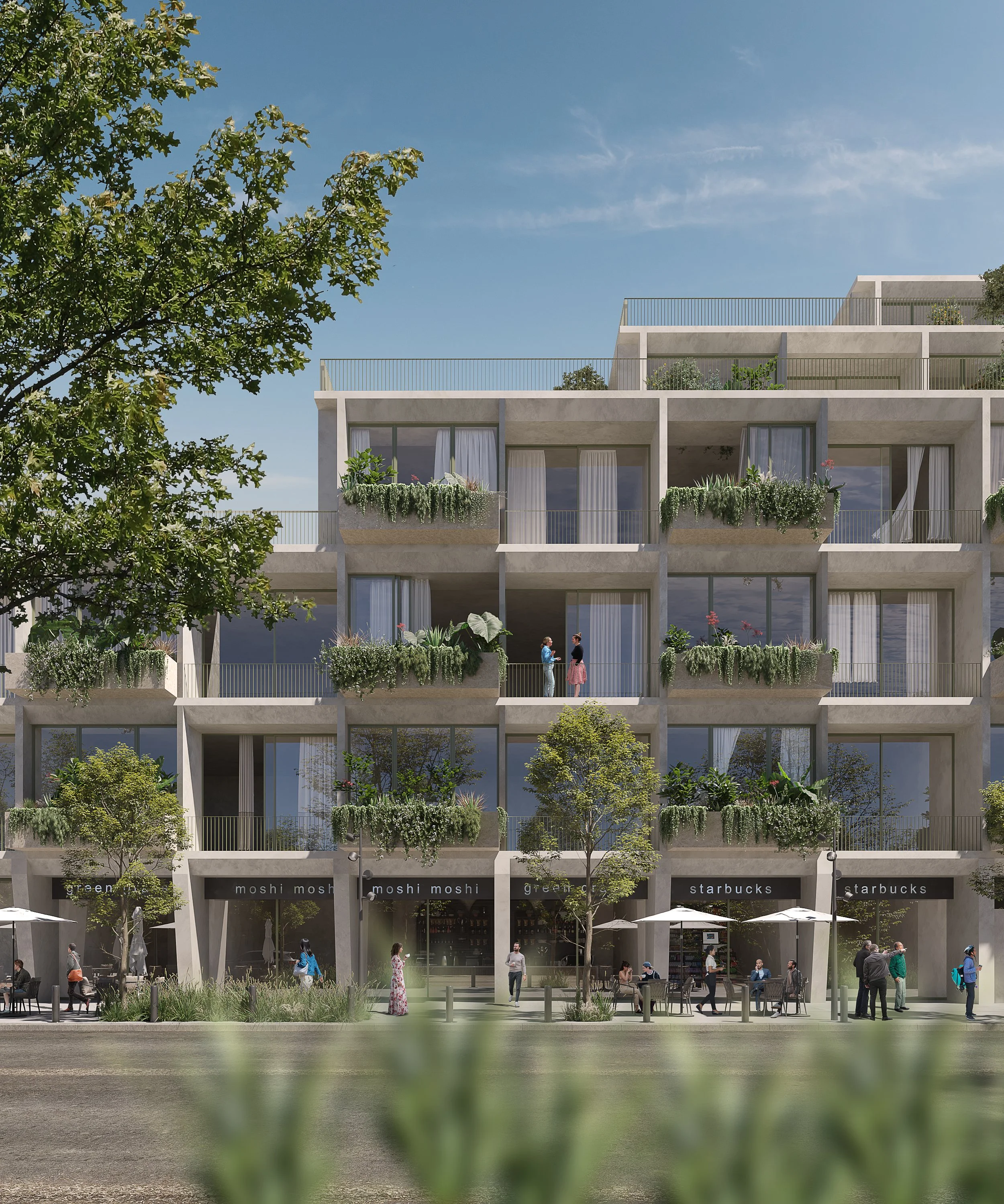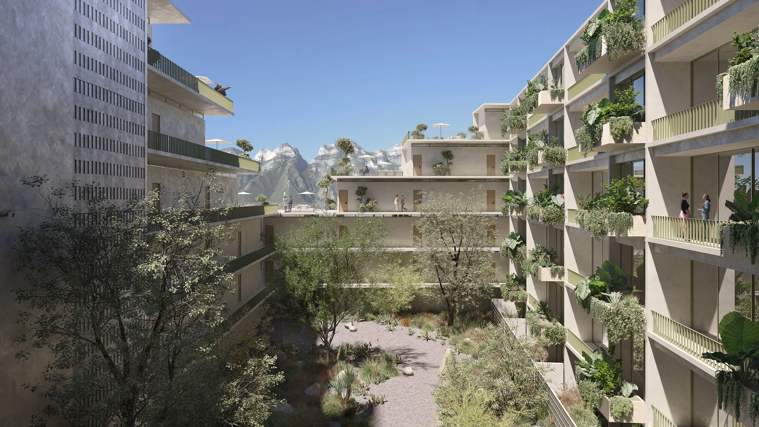 At the heart of the complex, a carefully designed garden serves as a social gathering point for residents. This green space, surrounded by pathways and seating areas, fosters interaction and integration among homeowners, providing a peaceful oasis amid the urban environment.