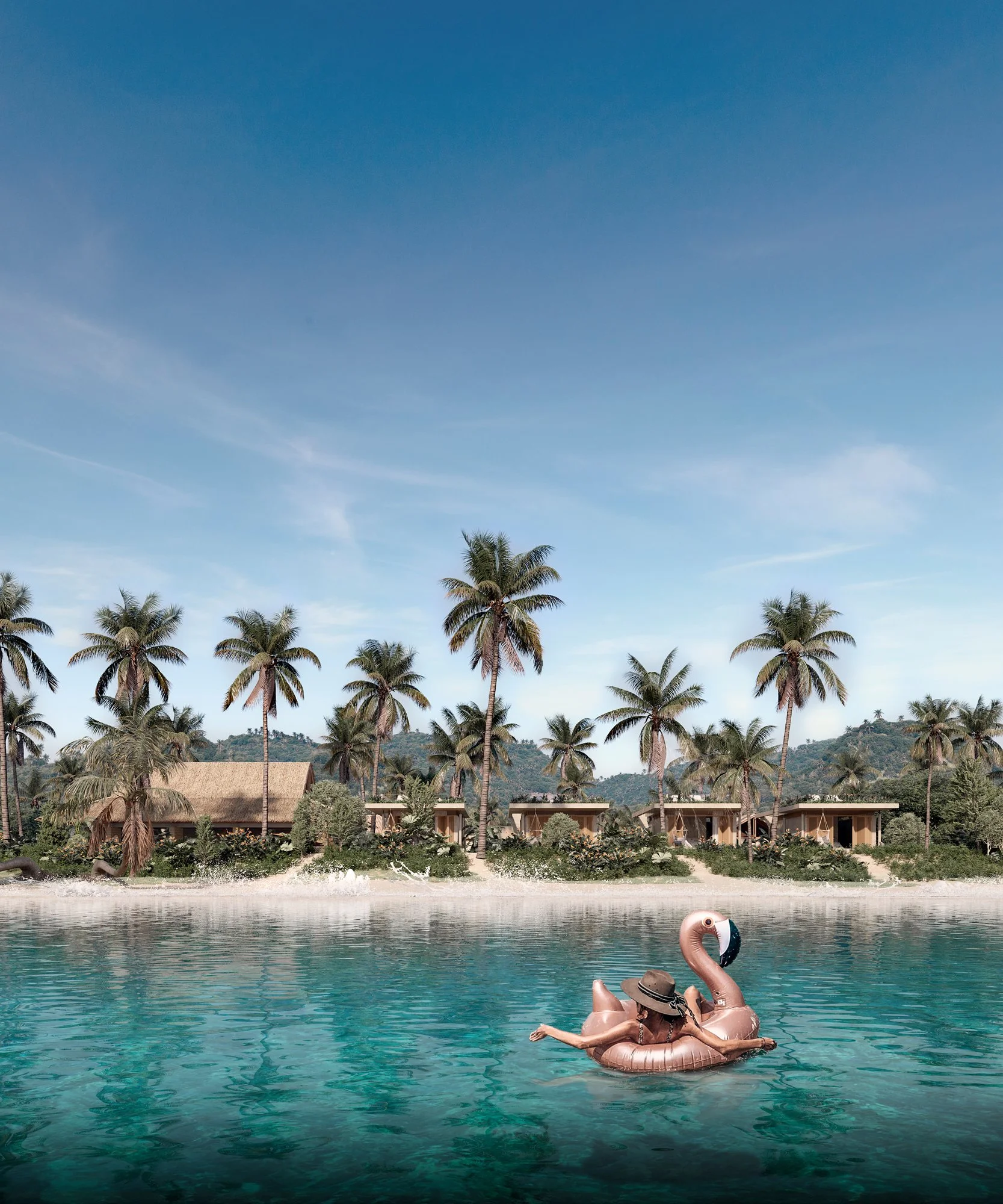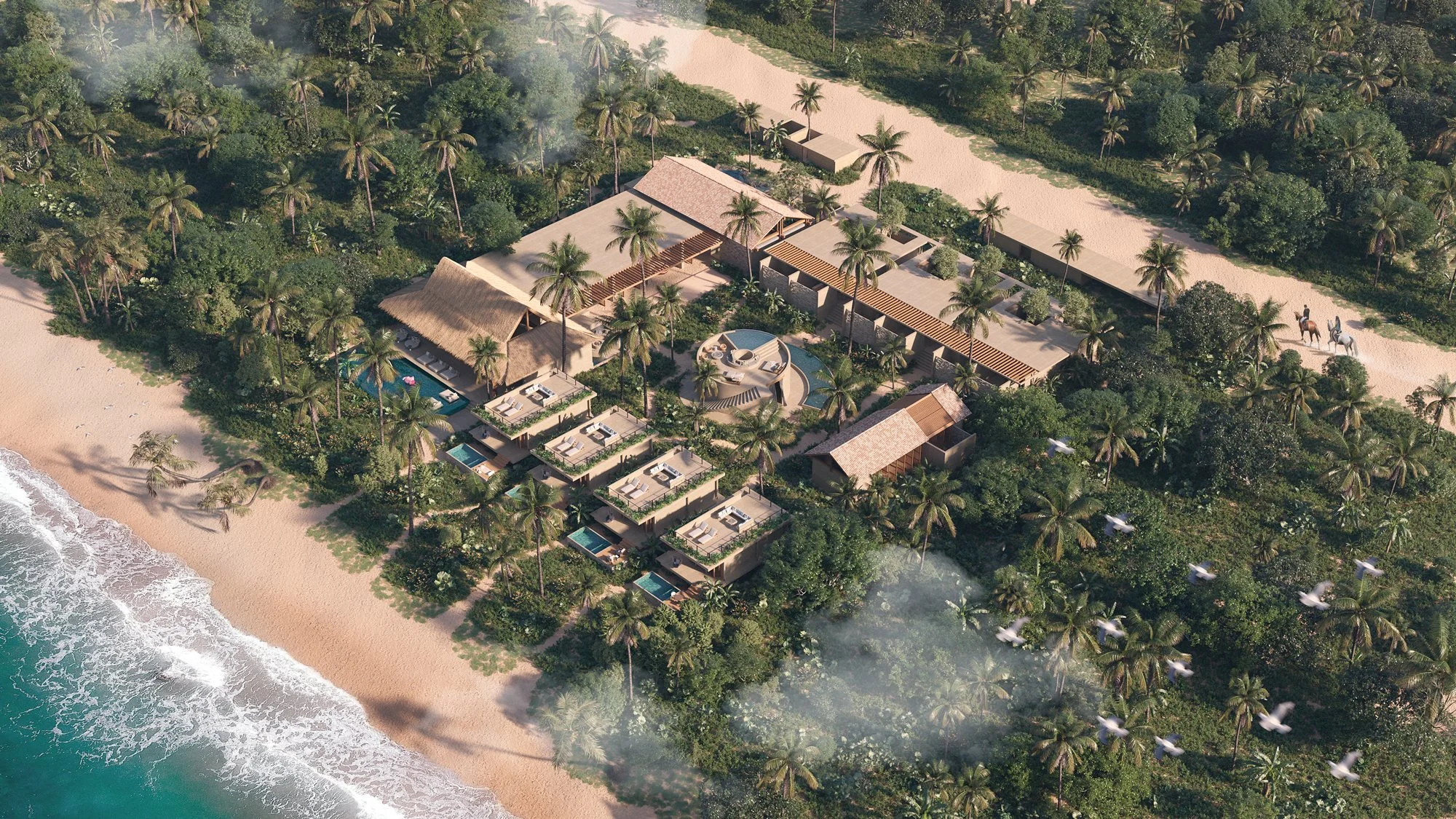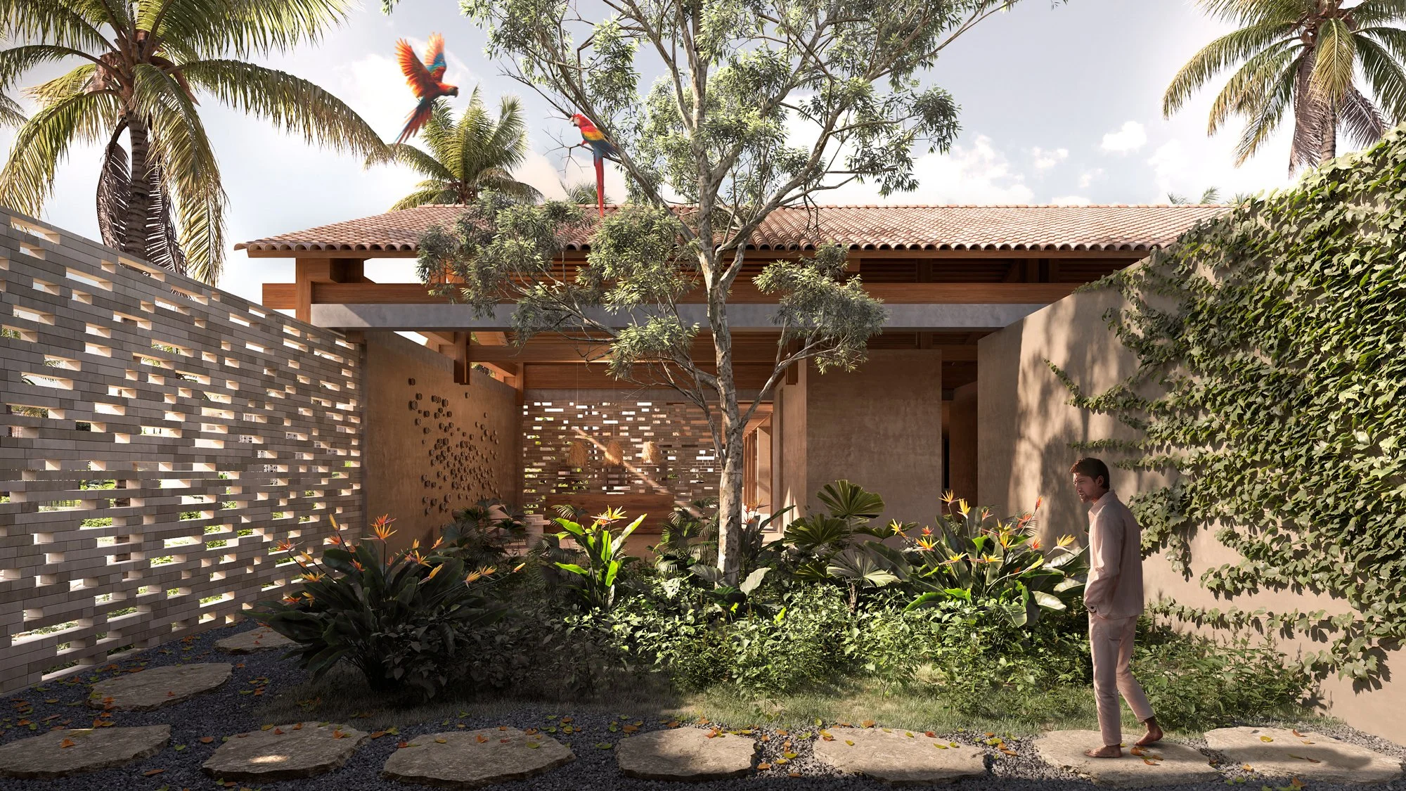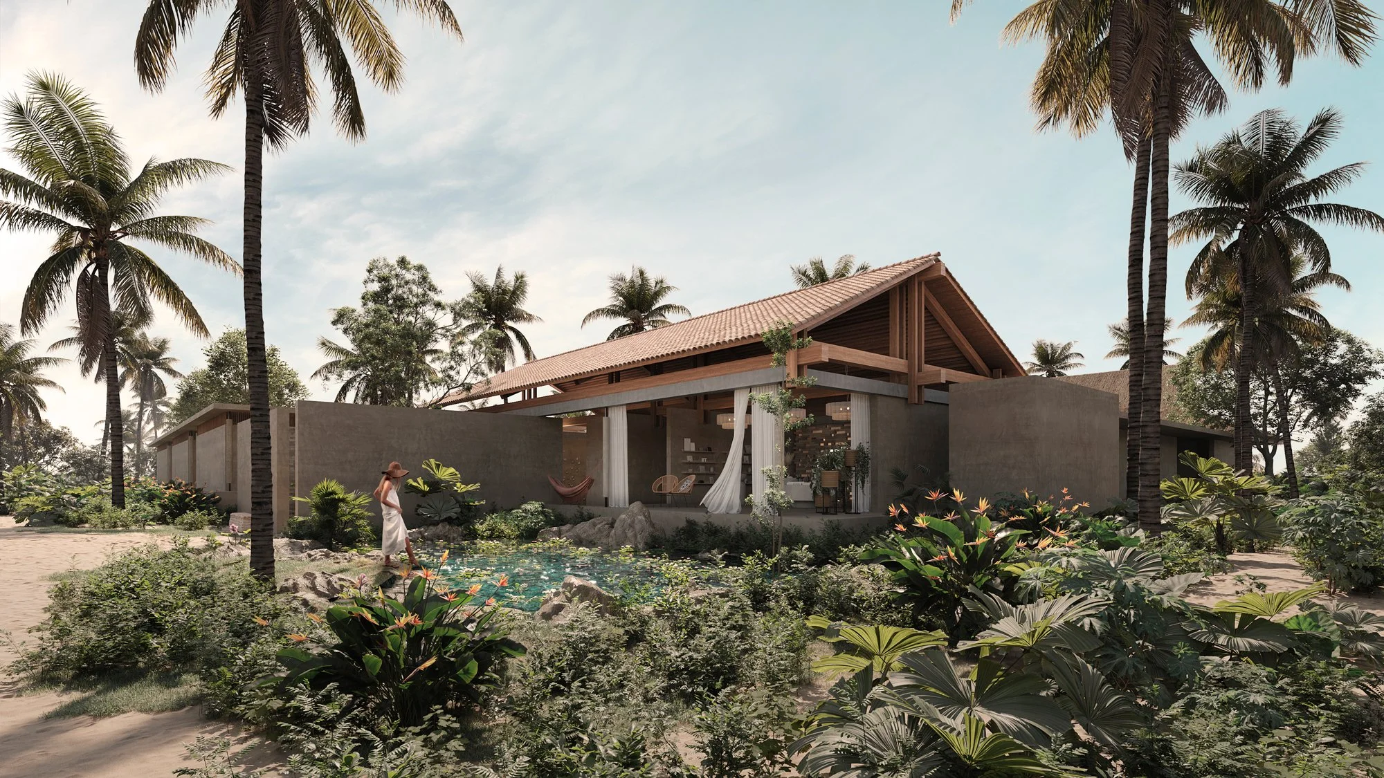 The guiding concept of the “Beach Hotel” project consists of distributing the program around a longitudinal axis running from north to south, extending from the street entrance to the sea. This axis divides the land into two parts: the social area, located on the west side of the property, which includes the main palapa that serves as a restaurant and event area, the infinity pool, gym, bar, game room, fire pit, and pétanque court. The other part of the property contains the private area of the project, where bungalow-style rooms are arranged along the northern and southern perimeters of the land, leaving a large green courtyard in the center. This courtyard features native vegetation and a structure for meditation, contemplation, and wellness activities, surrounded by plants, water, and the local wildlife, serving as an extension of the surrounding landscape.