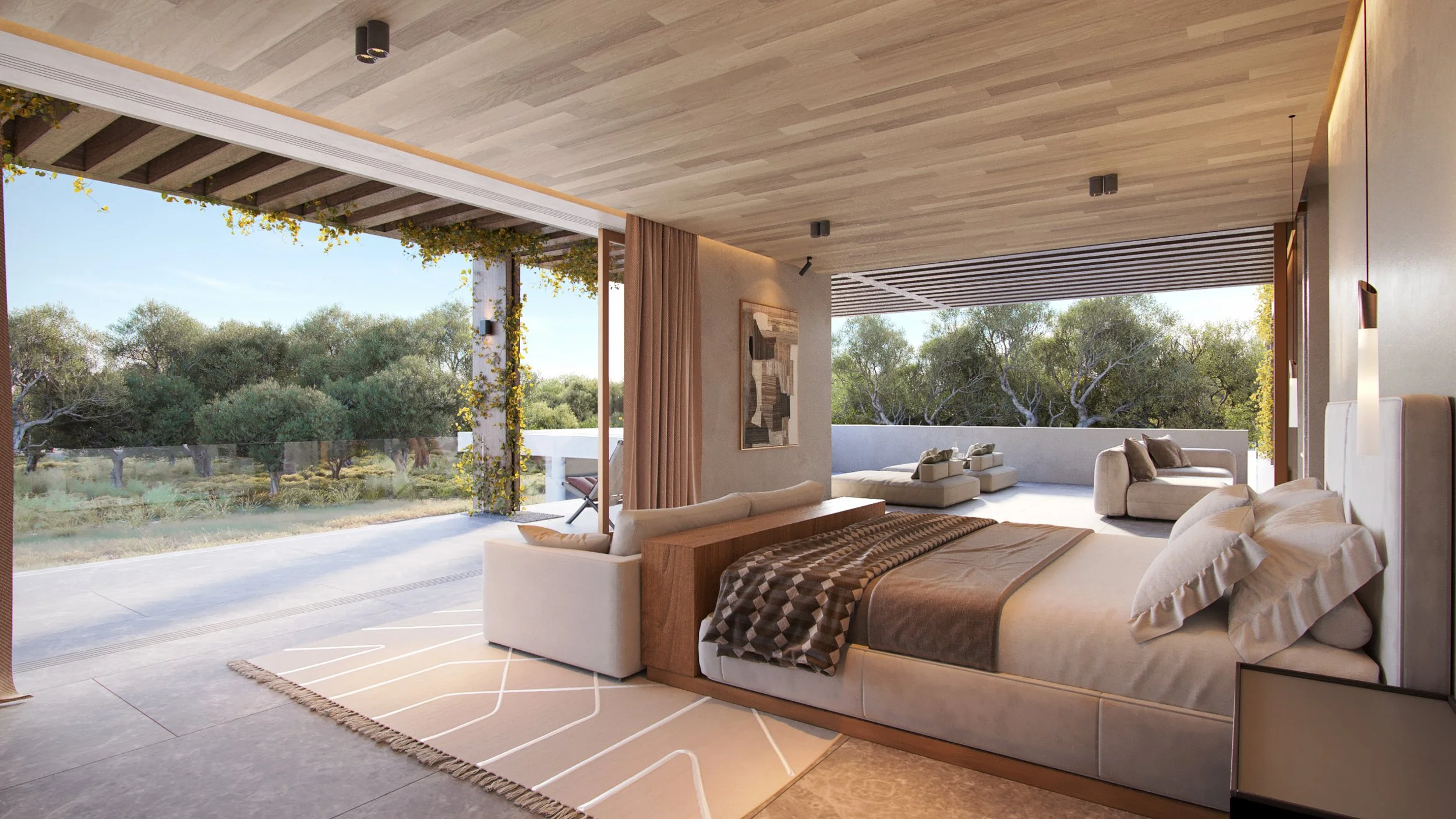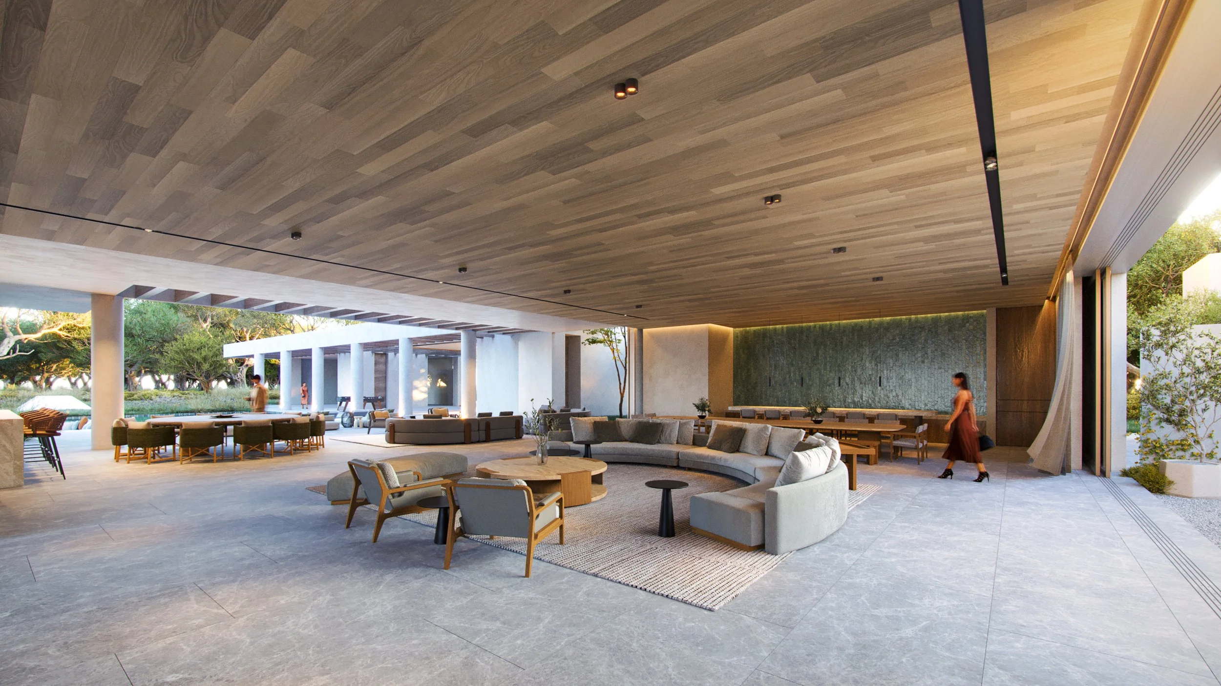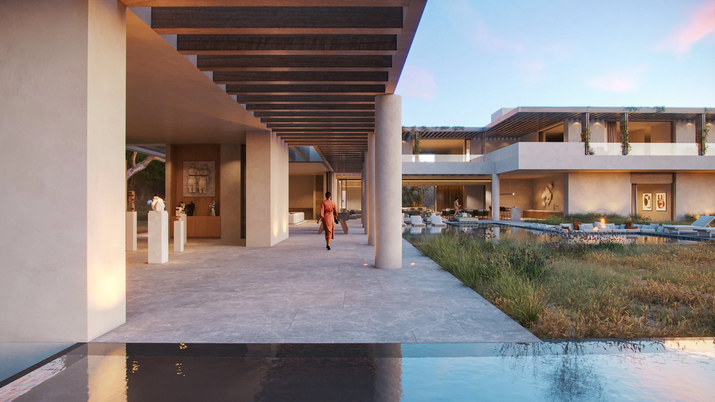 Upon entering, visitors are welcomed into the home’s social area, where the living room, dining room, and kitchen are located, forming a central atrium that offers a framed visual extension toward Da Alberta Nova beach. The courtyard, a key element in the design, connects the social areas with the private spaces, including the bedrooms located on the ground floor. One wing extends northward, bordering the pool and outdoor patio, leading to a two-story art gallery that houses the family’s private collection.