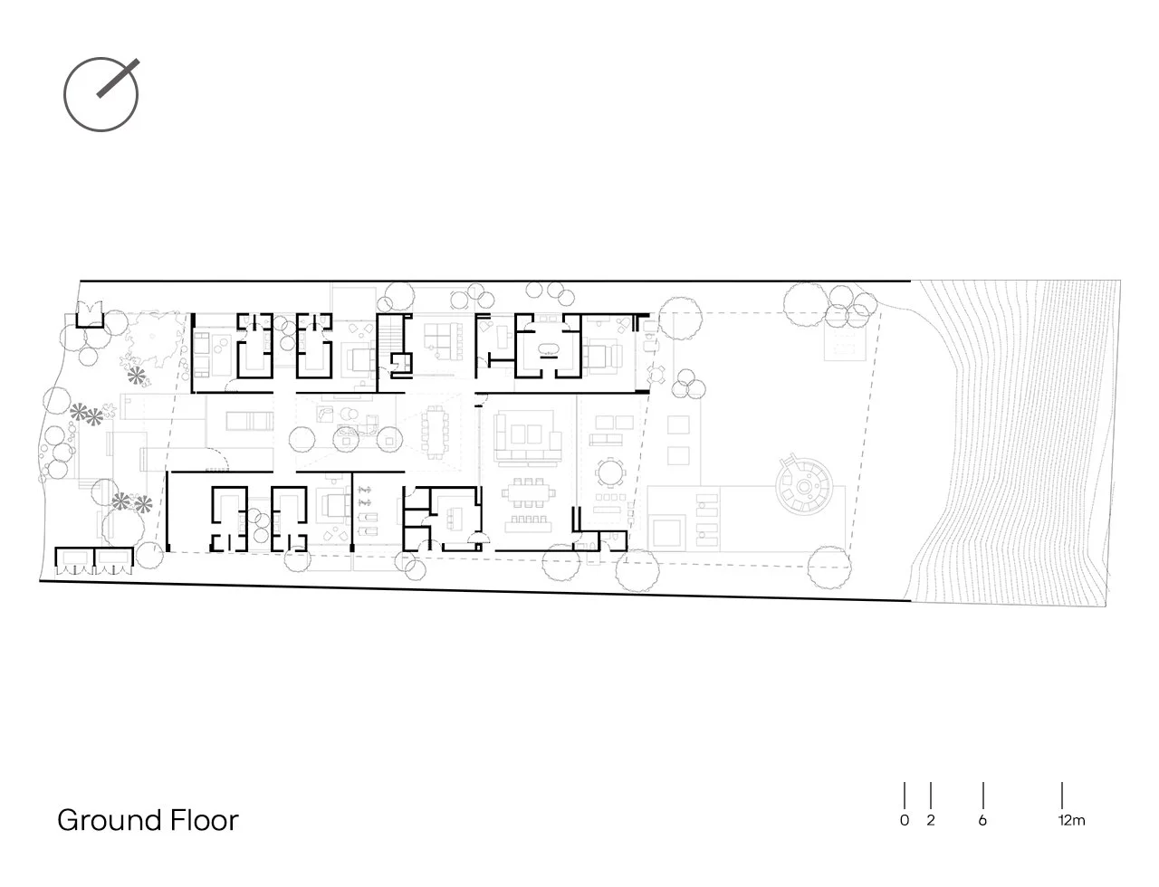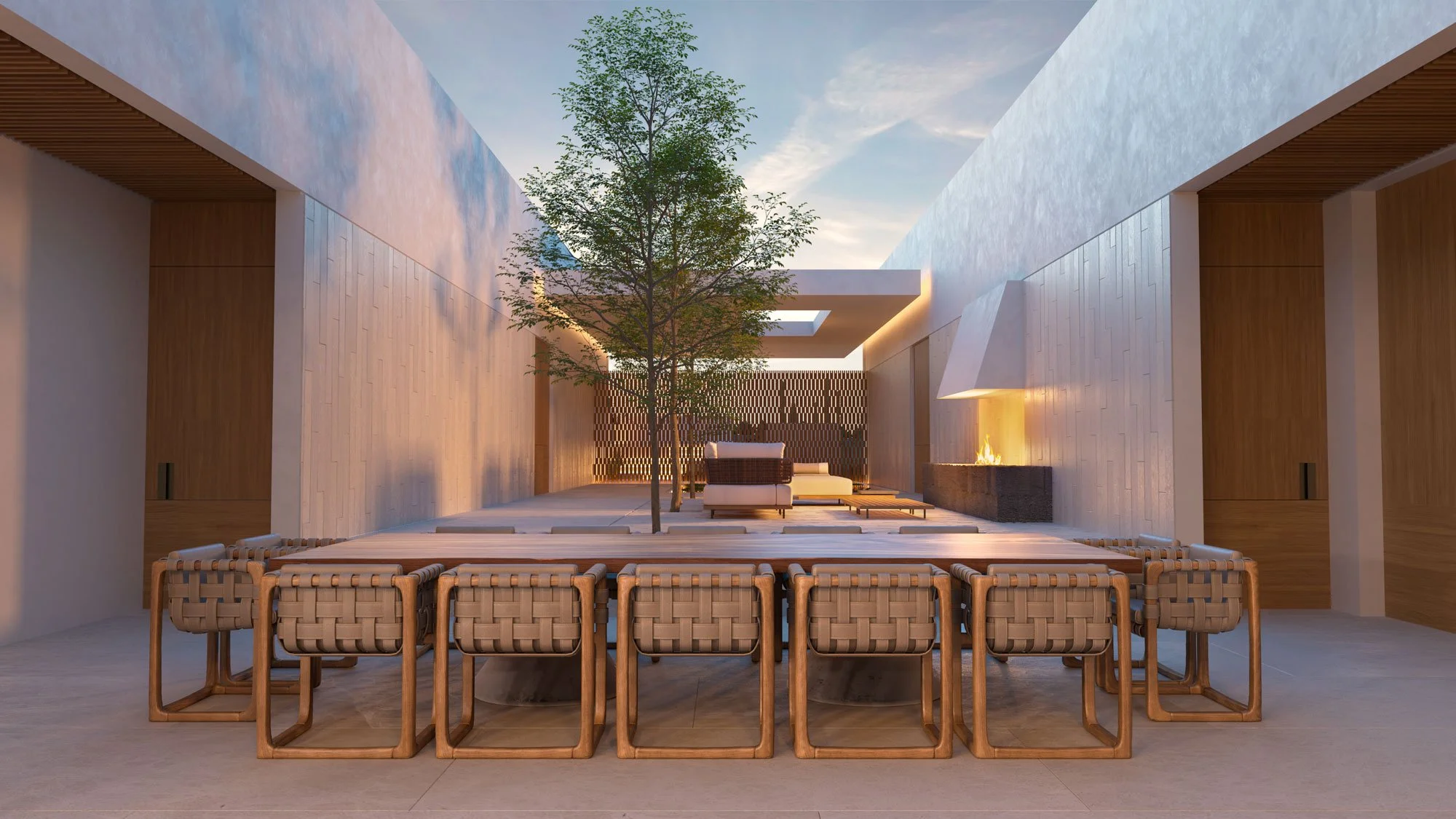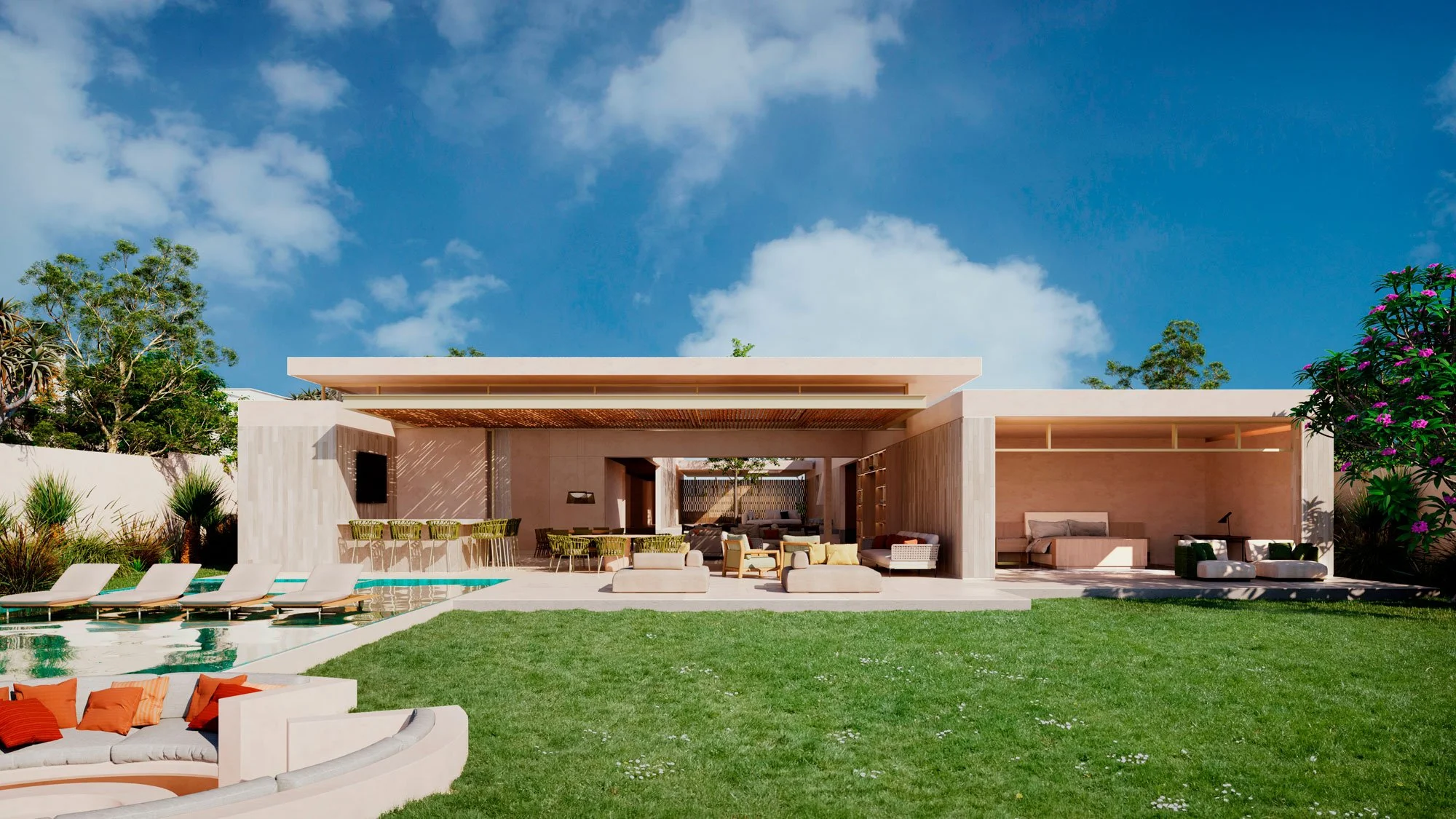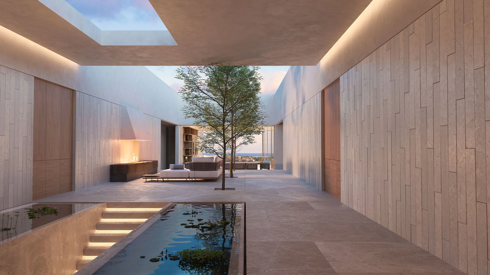 Visitors having to walk into a garden accompanied by the sound of a water feature that runs through the main entrance lattice and transforms into a pondlike body of water. This element is an important feature of the courtyard because it helps with the natural cooling of the space and the reflections create an interesting impression on the surrounding walls and ceiling. It also houses the stairway coming from the basement garage, giving the experience of moving from beneath the water, from a cool, dark space into an open-sky garden. The social program and experience are connected from this courtyard, towards the pool area, firepit, and posterior garden, with the living and dining area in the middle, opened to both spaces and creating the sensation of being under a modern interpretation of a palapa.