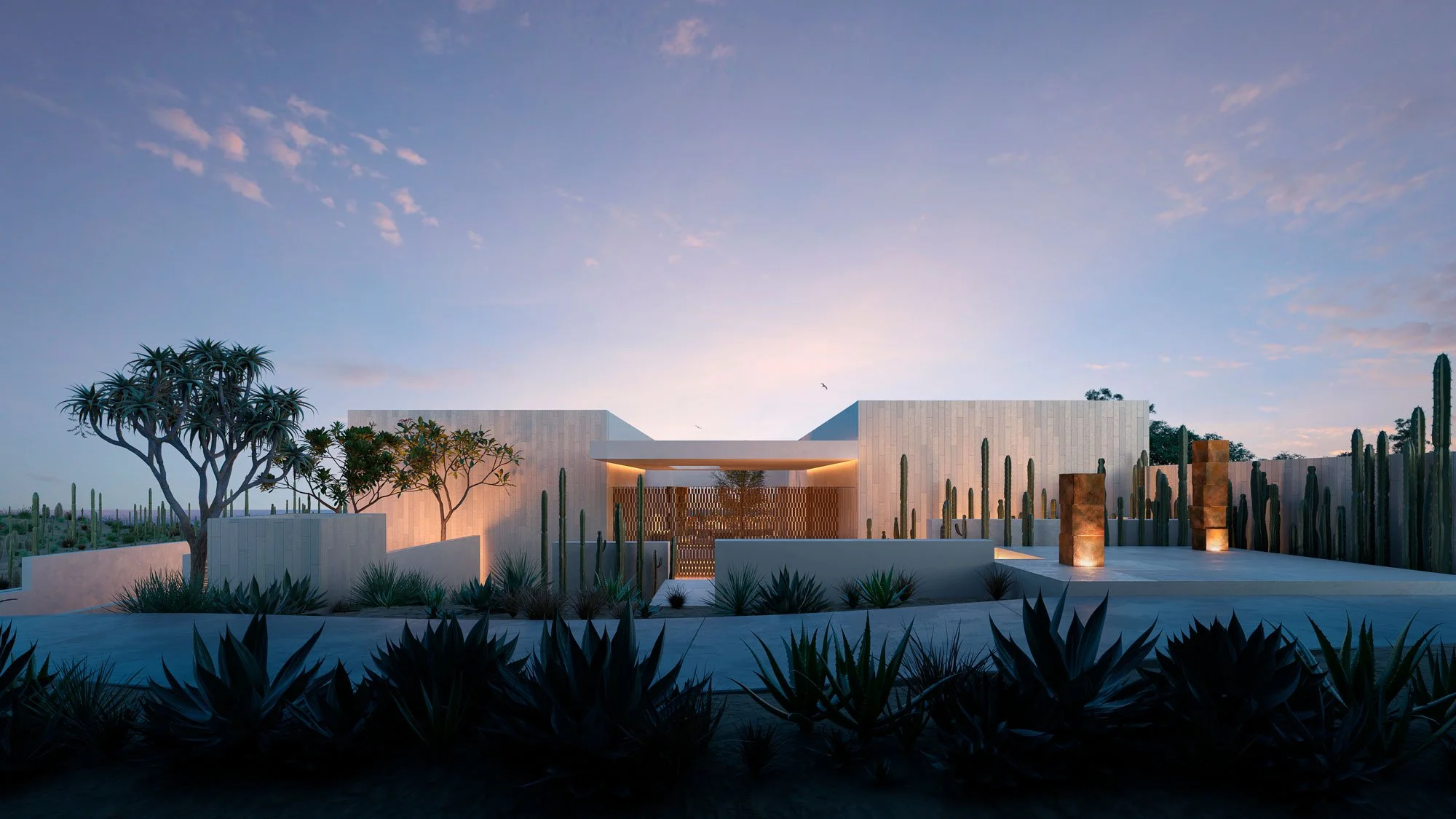 The architectural concept for this project revolves around a central courtyard, enhancing a strong linear axis from the street towards the ocean. The location of the house is on top of a sand dune, with an ocean view from San José del Cabo, Mexico. Having this elevation and proximity to the beachfront, it was almost natural to place the entire private program of the house around the main courtyard, with the social spaces and master suite towards the ocean view at the end of the previously described long axis. It was important to create different ambiences and user experiences along this axis. The main entrance of this single-level house is intended to lead to a quiet, mysterious space.