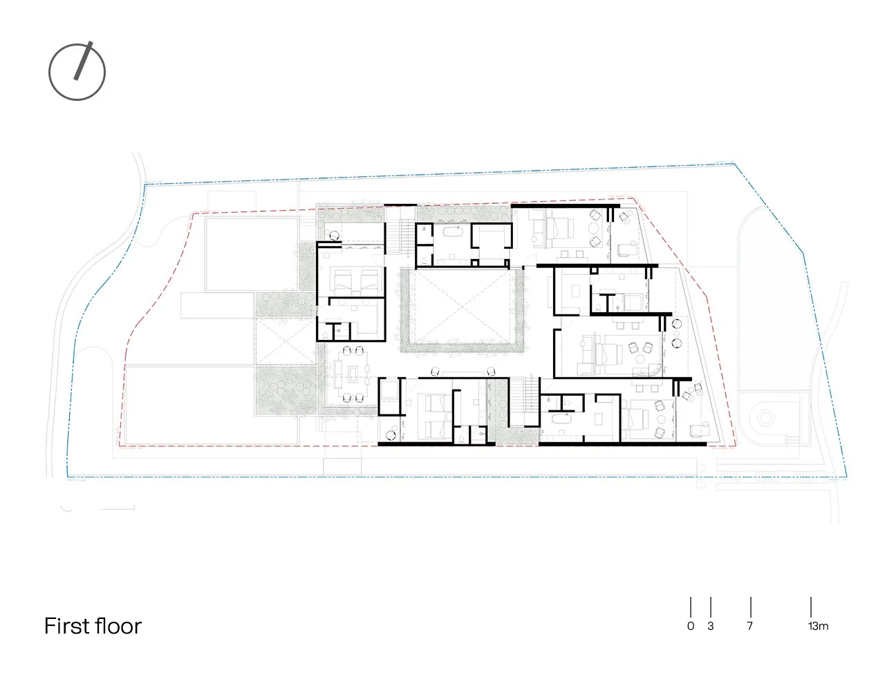 This project is located in Chileno Bay, San José del Cabo, Mexico, on a rocky oceanfront site. The architectural scheme has a central courtyard layout, crossed by a strong linear axis that connects the initial experience of entering the house to the ocean. This courtyard helps to organize the rooms on the sides of the ground floor, and the family bedrooms on the upper floor. The structure is conceived as a heavy, introspective mass or plinth, with directed views to gardens and water features.