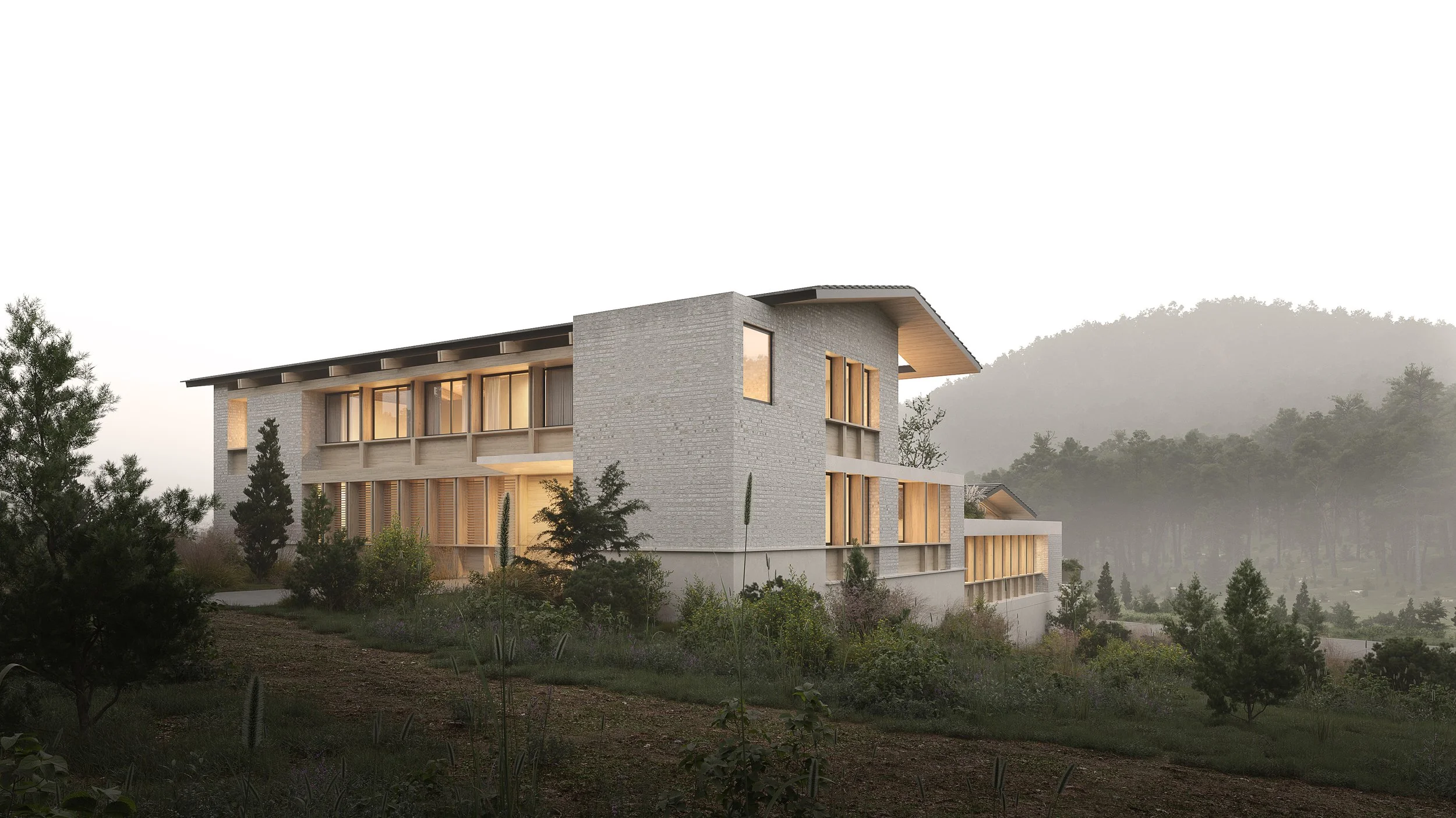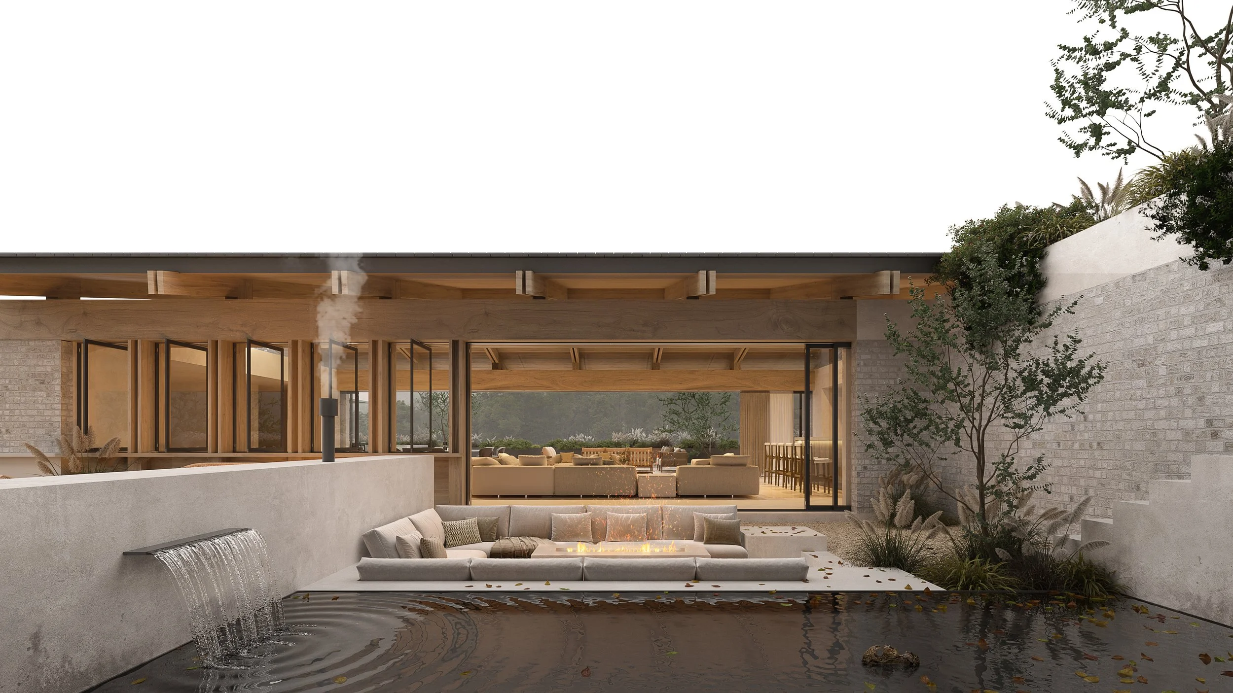 The second, smaller volume is the private area of the house, which includes the bedrooms, a private office, and a cozy living room with a fireplace. These are distributed over two levels, offering the best views of the forest thanks to the land's topography. A central courtyard connects the two volumes, featuring a firepit and a water mirror, providing a space for tranquility, enjoyment, and contemplation, surrounded by a dense forest just outside Mexico City.