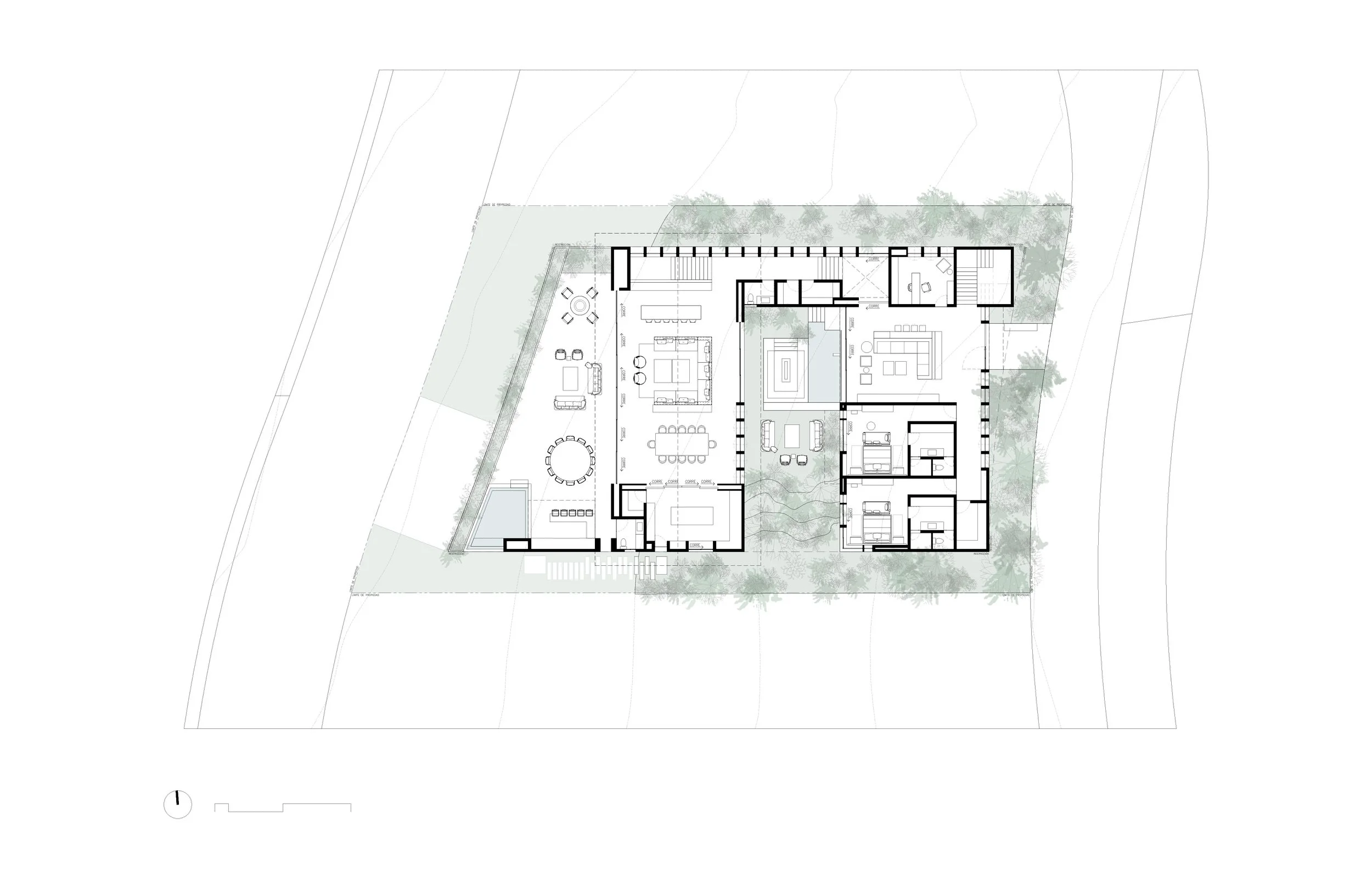 The project is situated on a steeply sloped parcel, dividing the project into two sections, each with different programs and activities. The first one, closest to the street, is the larger volume, with pedestrian and vehicular access at the forefront. This volume has two levels; the lower level houses the garage with space for four SUVs and a service area. Above this level is the social area of the house, featuring a large semi-covered terrace that includes the living room, kitchen, dining room, and a bar, as well as a heated pool in the uncovered section of the terrace.