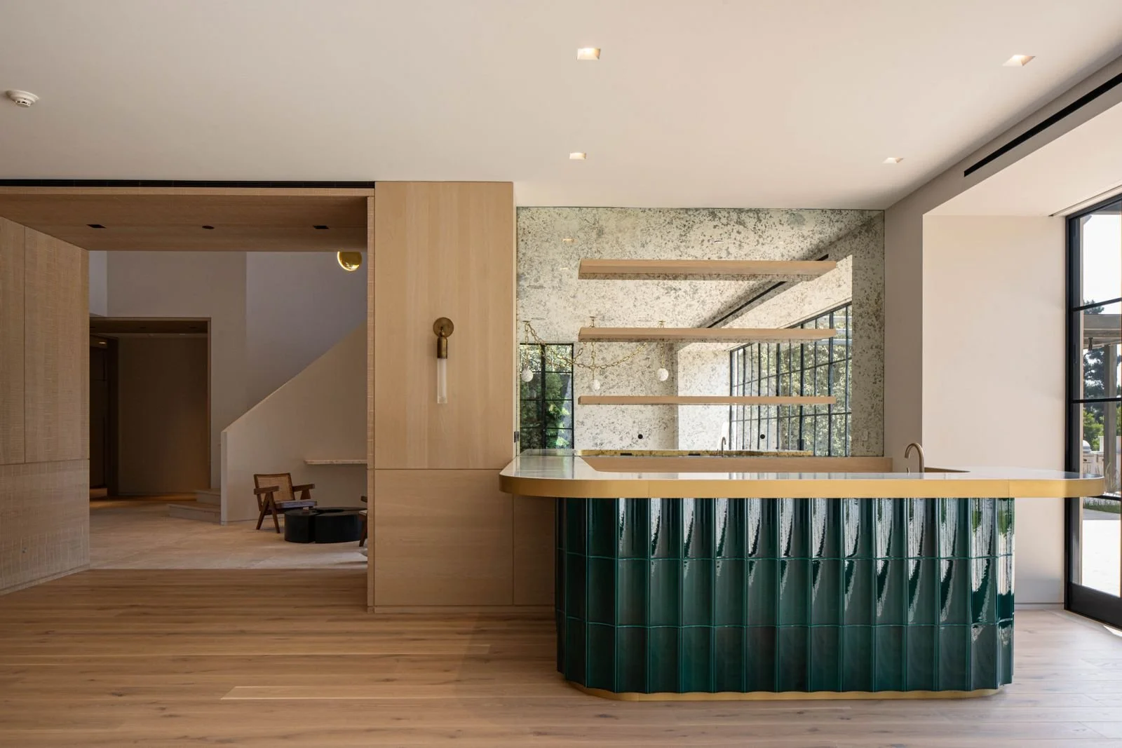 The kitchen combines modern functionality with natural aesthetics. Custom cabinetry is made from sustainably sourced walnut, paired with stone countertops and a full-height stone backsplash. A central island with a waterfall stone countertop provides a gathering space, illuminated by pendant lights with natural wood accents.
