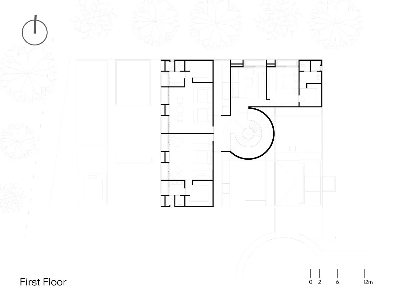 The ceiling above the staircase owes a debt to the skyspaces of James Turrell; during the day, it seems to float with the aid of indirect natural light, and at night with artificial light. Throughout the day, the staircase casts dynamic shadows, transforming the light and animating the entire residence. The house has an open plan designed for entertaining, allowing a natural flow between interior and exterior spaces. The indoor living and dining areas open into outdoor spaces that feature a pool, an extensive seating area, a sunken firepit with seating, and a kitchen and dining area protected by a pergola.