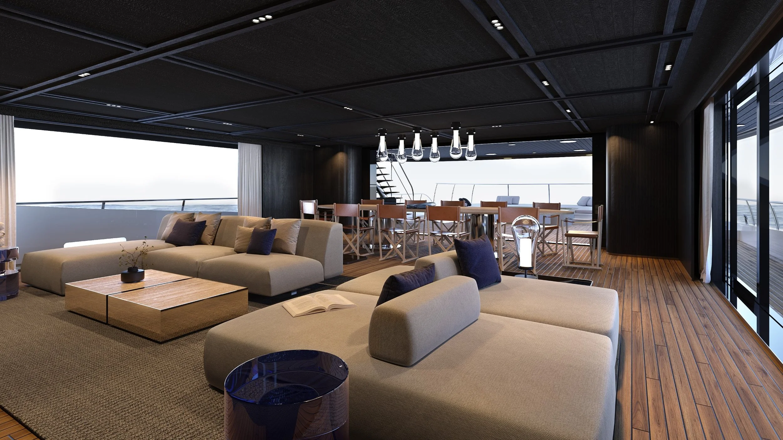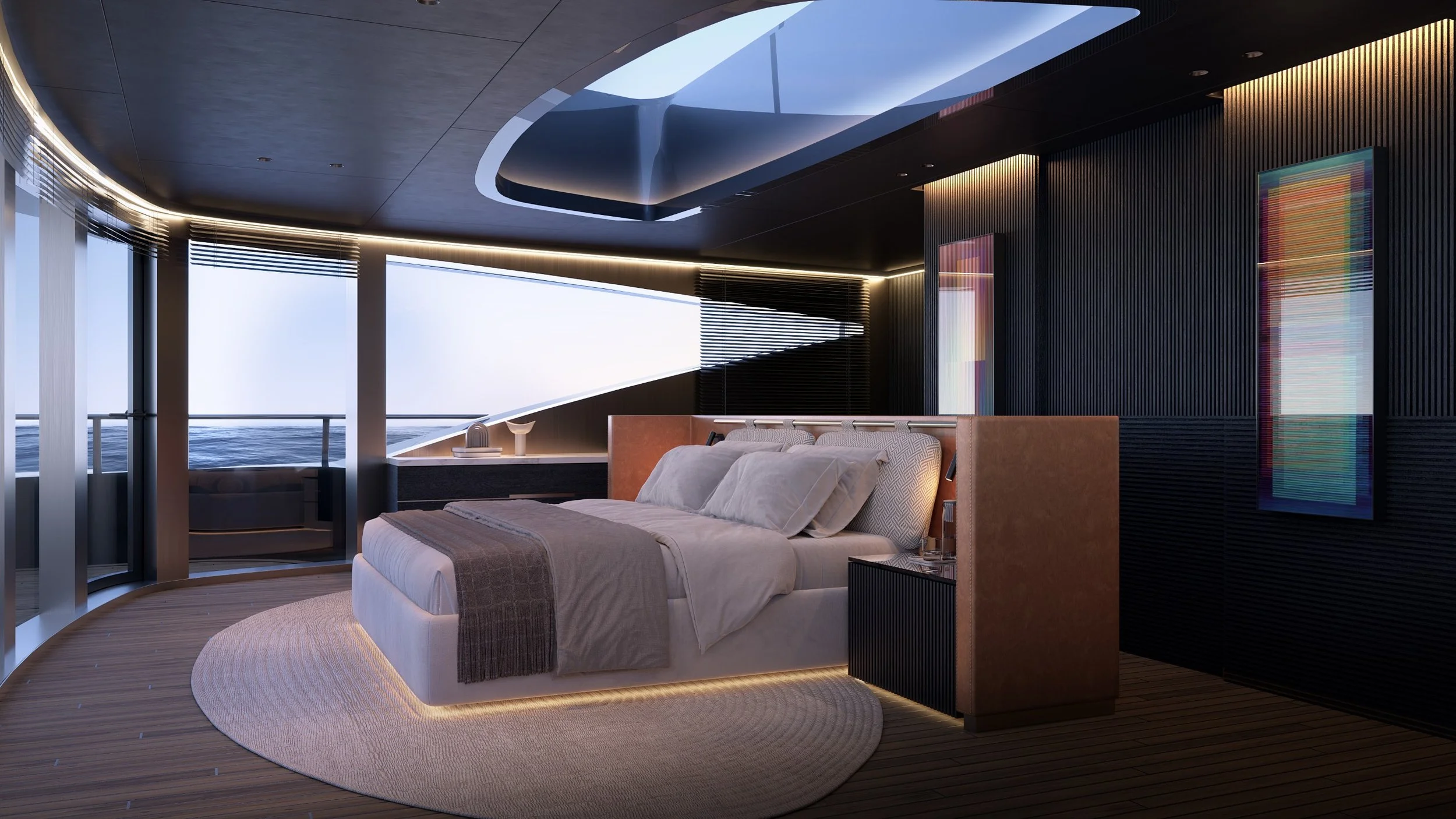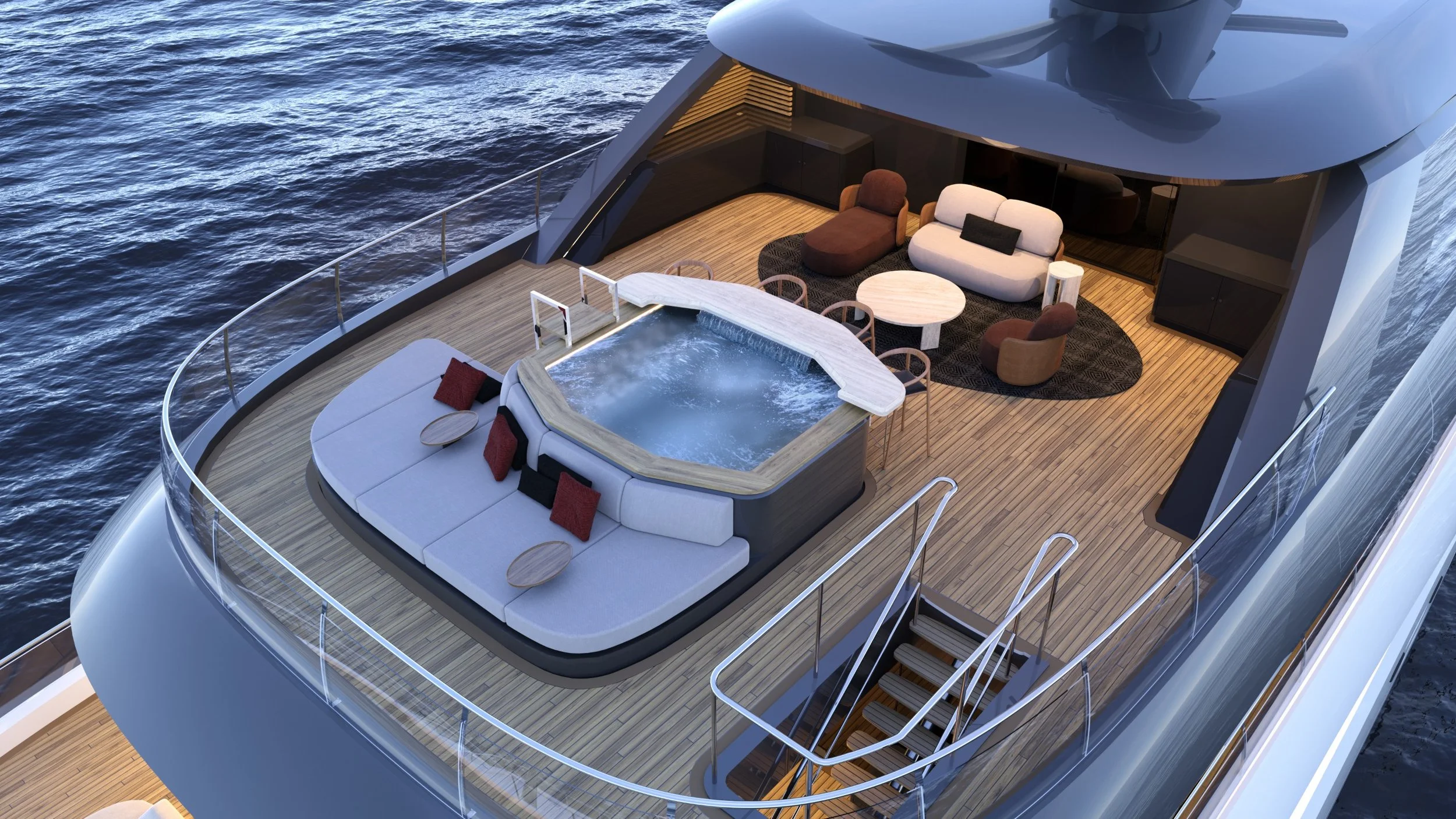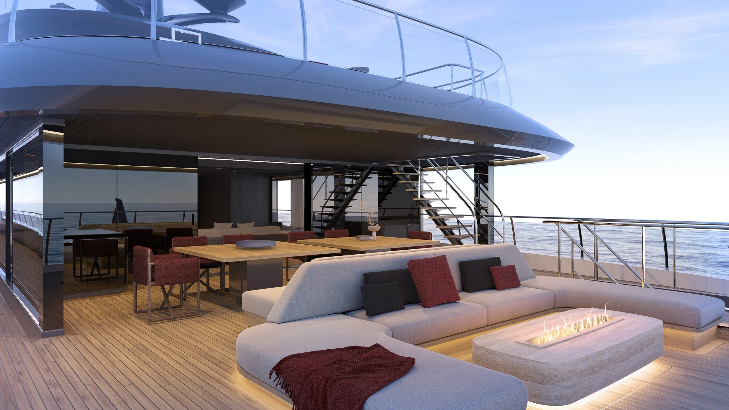 The foredeck serves not only as a sun terrace area but also as a helipad, and beneath it is a garage for auxiliary boats with capacity for a 7.5-meter-long speedboat. Its maximum speed is 24.5 knots, and it has a range of 4,000 nautical miles.